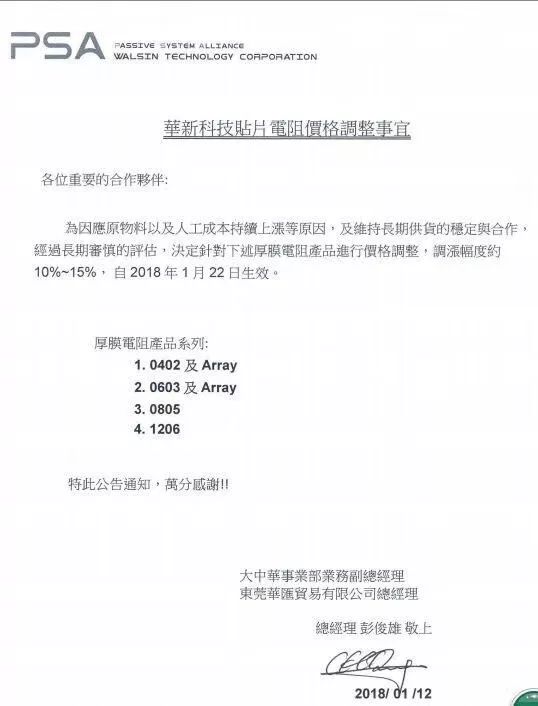 2018年1月12日,華新科技正式發(fā)出漲價(jià)通知,2018年1月12日,表示由于原物料以及人工成本持續(xù)上漲,決定針對(duì)0402、0603、0805、1206等厚膜電阻進(jìn)行價(jià)格調(diào)漲,漲幅達(dá)10~15%,自2018年1月22日生效。